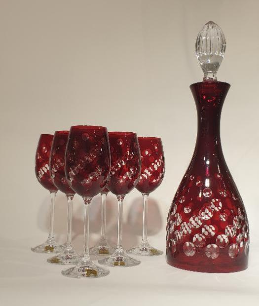 Coffret carafe et 6 verres à vin élégants boules rouge rubis en cristal bohème