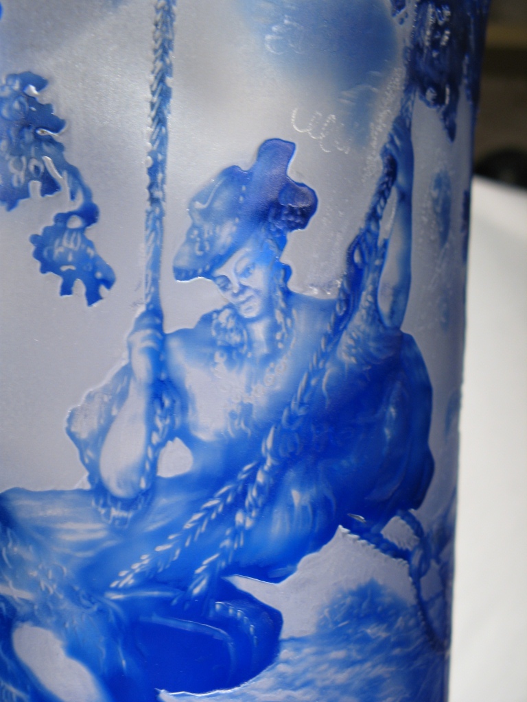 La Femme sur balançoire et le décor tout autour du vase en cristal est taillée à la main.